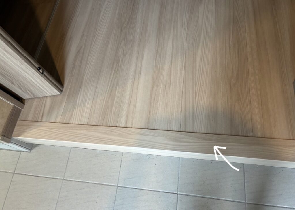 矢印線上の玄関框の模様がぱっくり分かれてしまっています;;本来ならば、割れ目が分からない綺麗な木目のはずなのですが、製品不良の為、こんな状態に・・・・せっかくの新築。そして自身やお客様が一番最初に出入りする玄関框!綺麗に補修させてもらいました!!!!
