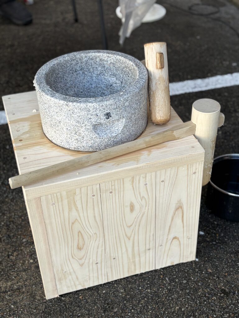 昨年は臼を支える土台が無く、ダンベルだったのですが、今年は職人さんが即席で作ってくれた土台です♪流石!!!!